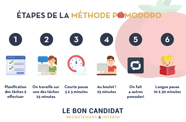 La méthode Pomodoro consiste à gérer son temps de travail grâce à un minuteur réglé sur 25 minutes de travail sans interruption puis de prendre régulièrement des pauses de quelques minutes.